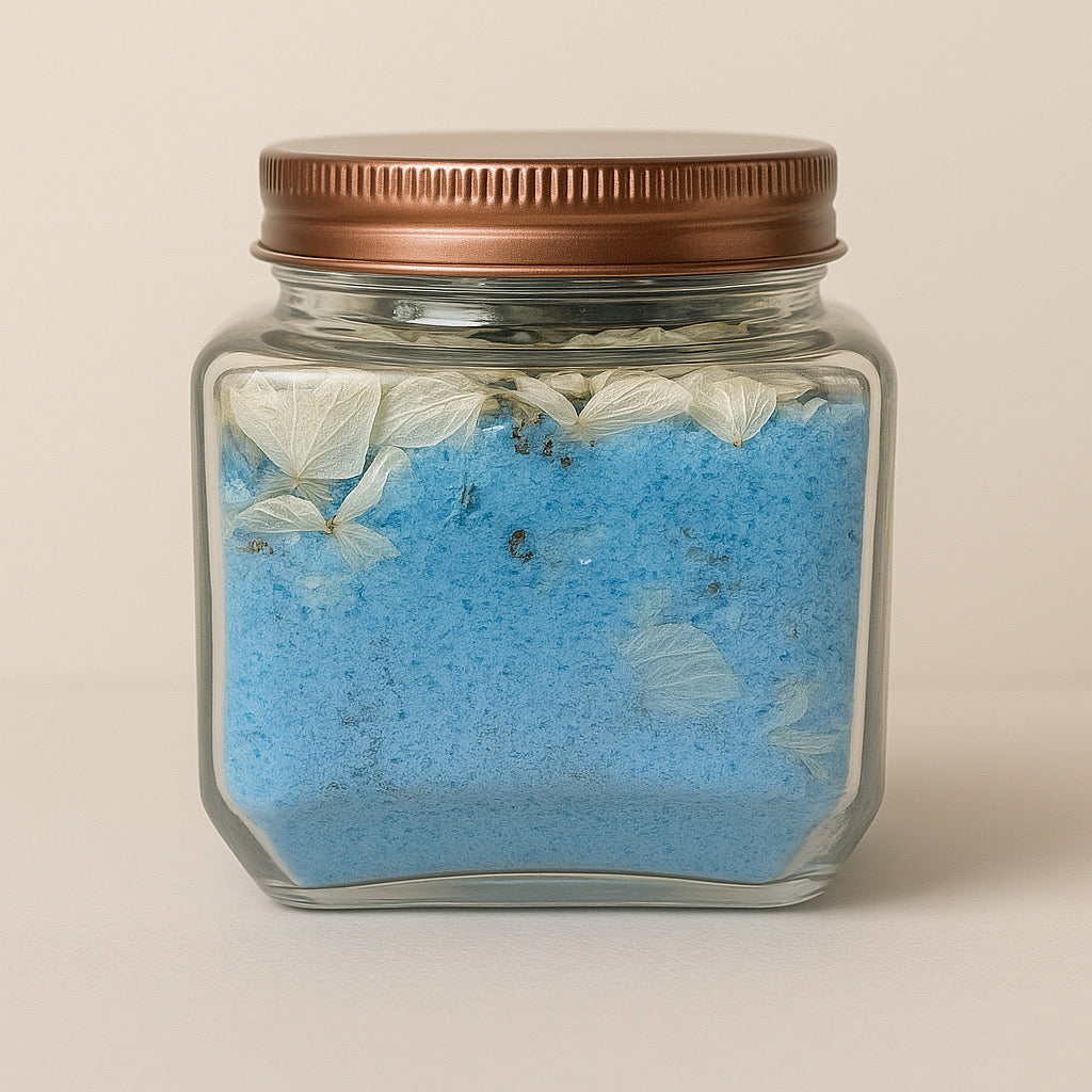 Epsom Salt, Sea Salt, Baking Soda, Citric Acid, Mint and Eucalyptus leaves, Hydrangea flowers, Mica powder, and Tea Tree essential oil.